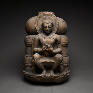 The Buddha sits enthroned, instead of in the more usual cross-legged position, and holds his hands in the preaching gesture, associated with the proclamation of doctrine. He is the teacher whether as a wandering monk, as in the earlier tradition, or as in the later, a divine figure preaching advanced doctrines at celestial gatherings. The pose is commonly referred to as 'Hellenistic or European' as it was associated with the manner of posture and depiction of Greco-Roman figures at the time.