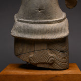 A fragment with losses at extremities; repaired breaks at the base with associated small losses, underside drilled for mounting to stand; later wood stand sun-bleached and water-stained; scattered losses, chipping, nicks, and abrasions to stone; particularly to back of sampot; surfaces moderately soiled.